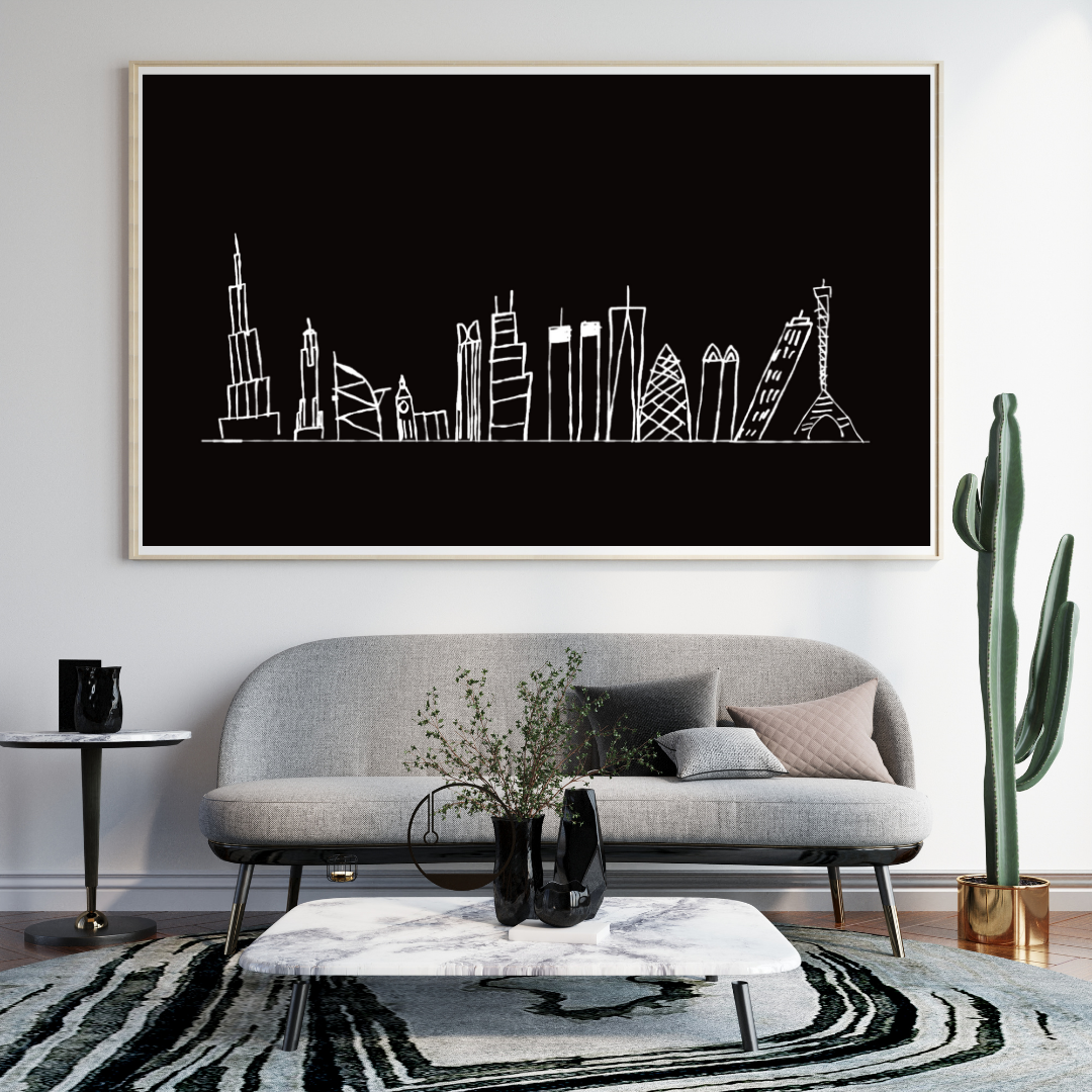 From the Burj to the Eiffel, all your favorite skyline stars strut in a single row. Minimalist and quietly epic.
